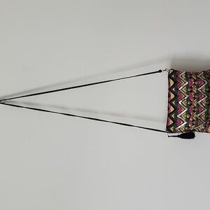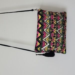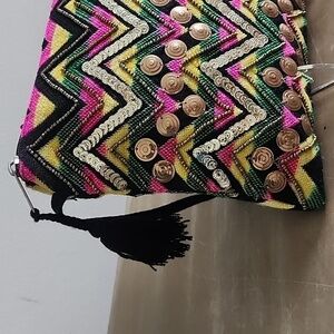 Turn heads with this bold and stylish embroidered crossbody clutch! Featuring a vibrant zigzag pattern in shades of pink, green, gold, and black, this bag adds the perfect touch of texture and color to any outfit. It includes a detachable black strap and a fun tassel detail on the zipper for added flair.