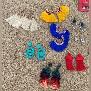A stunning collection of tassel and beaded earrings in vibrant colors. Features cream, yellow, blue, turquoise, red, and multicolor designs.