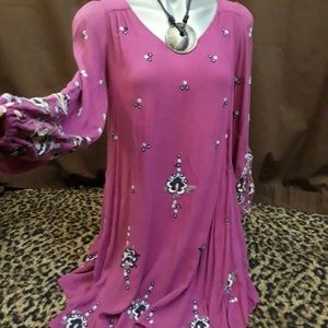 Bohemian Embroidered Floral Mini Open Back Tunic Dress Pink Lilac XS FREE PEOPLE