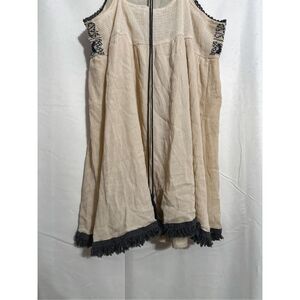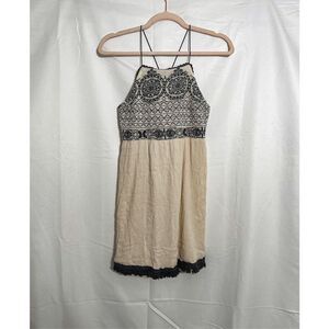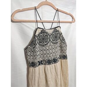 Embrace a bohemian vibe with this beautifully embroidered halter top. Featuring intricate black patterns on a cream background, this top is perfect for casual outings or festivals. Pair it with your favorite jeans or a flowy skirt for a chic look.