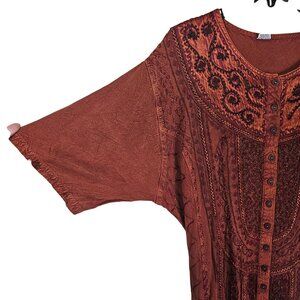 Bohemian Embroidered Maxi Dress OS Rust Button Front Tie Back Flowy Viscose