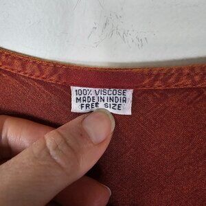 bohemian dress, rust maxi dress, button front dress, tie-back dress, embroidered dress, viscose dress, free size dress, casual dress, short sleeve dress, India dress, hand wash dress, summer dress, warm weather wear, summer picnic dress, feminine, lagenlook, one size, relaxed fit, long dress, boho, festival, hippie