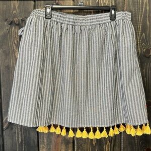 Boutique brand Andree by Unit faux wrapped mini skirt. Size 3X. Grey. Striped pattern with bohemian embroidery. Yellow tassel details. Bow tie front. Elastic waist. Stretch material. Lined. Preloved. Please see all photos for condition.