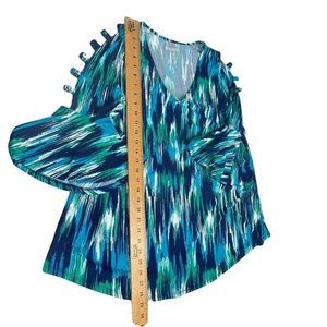 Bohemian Flair Sleeve Blue Space Tie Dye Top size 14 16. Roaman's plus size bell sleeve blouse with cutouts along the shoulder and upper arm. 95% Polyester 5% Spandex