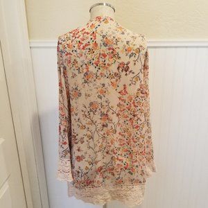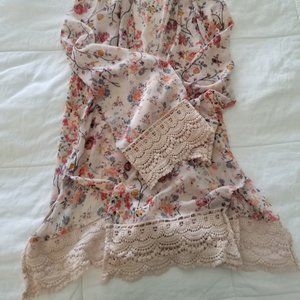Excellent condition. 17' armpit to armpit, 30" from shoulder. Great for summer. With jeans, shorts, a beach coverup. Light pink Lace around the sleeves and trim. Light weight, sheer.