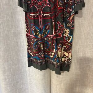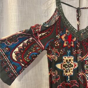 Embrace a bohemian vibe with this stunning floral mini dress. Featuring a vibrant mix of red, blue, and green, this dress is perfect for any casual outing. The intricate patterns add a touch of elegance and style.
