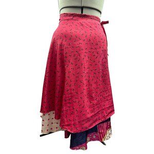 This bohemian wrap skirt is a stylish and versatile addition to any wardrobe. With its vibrant floral pattern and asymmetrical hemline, it offers a unique and eye-catching design. The wrap style allows for adjustable fit, making it comfortable and flattering for various body types. No size tags, please read measurements.