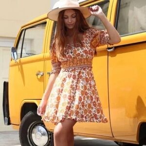 Retro bohemian floral printed mini dress with ruffled trim and elastic smocked waistline and sleeve detail.