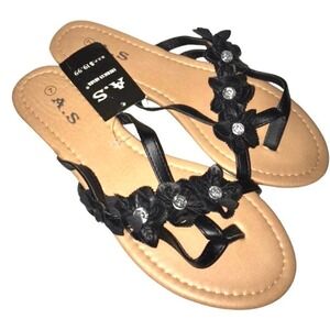 New size 7 sandals with pretty black bohemian flowers accented with rhinestone centers