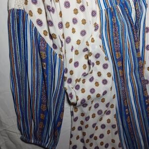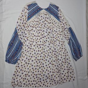 Free People Stylish bohemian dress with a white base and blue patterns. Features purple and brown accents. Perfect for casual wear.