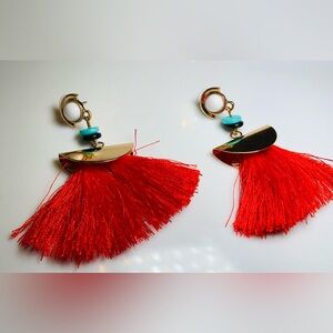 These bold, statement earrings feature vibrant red tassels that dangle from gold-tone hardware. The upper part of the earrings includes a combination of white and turquoise beads, adding a playful touch to the design. The bright red tassels are eye-catching and perfect for adding a pop of color to any outfit, whether for a casual look or a special event.