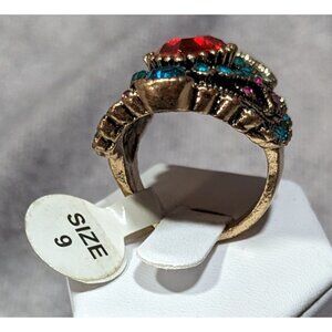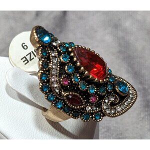 This stunning Bohemian Glam Cocktail Ring features vibrant red and blue gems, adding elegance to any outfit. Perfect for special occasions or a night out, this ring is sure to make a statement.