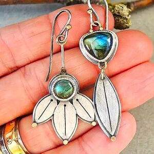 Handmade lotus flower irregular mix match minimalist engraved drop dangle earrings.