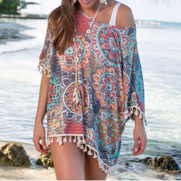 Embrace the beach vibe with this bohemian multicolor swim cover-up. Perfect for adding a splash of color to your swimwear ensemble. Beautiful print with a tassel hem. Perfect for beach day, festivals, travel, chill days, etc .. One size