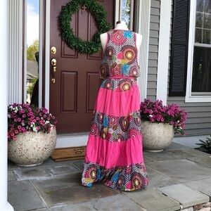 Cascading Maxi dress, pink with greens, black, brown, blue, white, red, purple motif. Ruffle skirt, flowing.