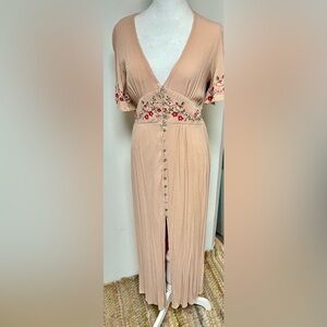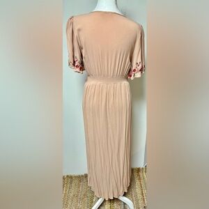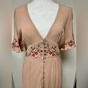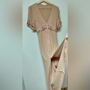 Bohemian maxi dress featuring floral embroidery on the sleeves and waist.