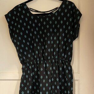 Slip on dress with elastic waistband, short sleeves and a crisscross back.
