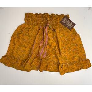 Unique bohemian-style Junglee Billee shorts in a mustard yellow base with delicate pink and green floral patterns. Designed with a smocked elastic waist, wooden bead tassel tie, and ruffled hem for a playful finish. Lightweight and breezy, perfect for festivals, summer days, or casual outings.