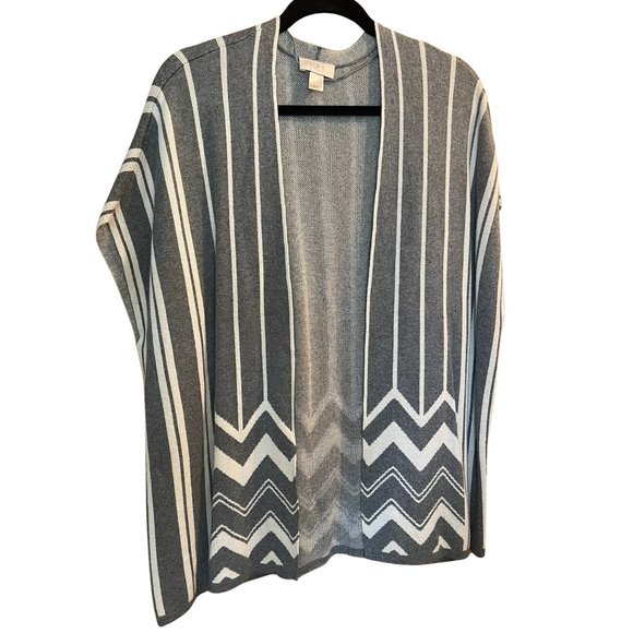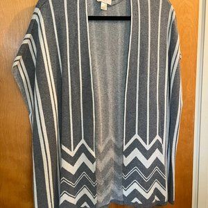 Features grey and cream vertical stripes throughout and chevron horizontal pattern on lower portion. Runs large and could also easily fit M/L. Pair with leggings for casual wear and warmth.