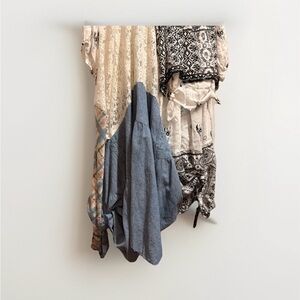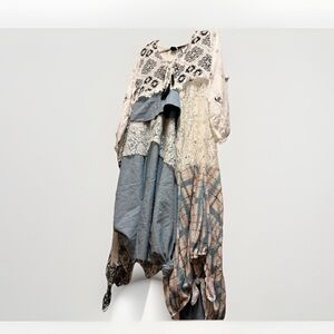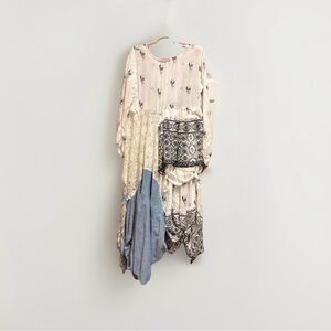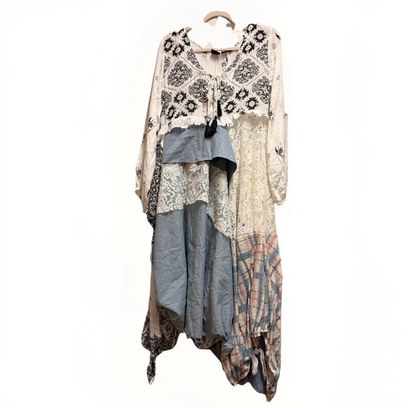 Flowy bohemian dress with patchwork design. Features black, cream, and blue patterns.