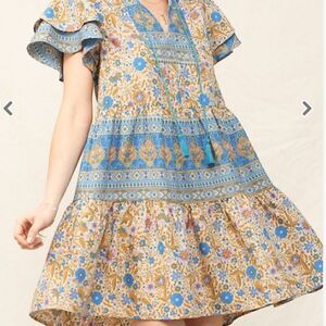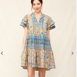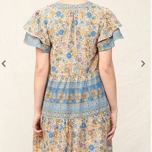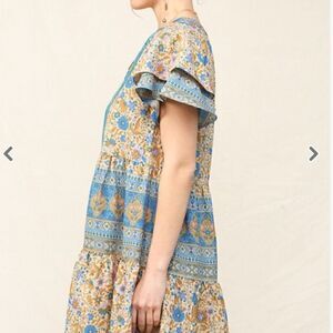 Bohemian Pattern Blue Floral Mini Dress Flutter Sleeves Easter Casual