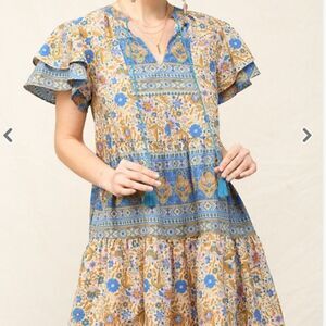 NEW in package! Embrace your bohemian spirit with this stunning blue and cream floral print mini dress from GIGIO. The flounce sleeves and tassel tie neckline add playful accents to this chic piece, while the V-neckline and short length make it suitable for any occasion, whether it's travel, party, casual, workwear or business. The dress is made of polyester and rayon fabric, which is machine washable for easy care. A perfect addition to your wardrobe, this dress is available in regular size and features a vintage-inspired bohemian theme that is sure to turn heads. The dress is not only perfect for summer, fall, winter, and spring, making it suitable for anyone who loves the boho-chic style. Don't miss out on this must-have dress that is both comfortable and stylish. Available in women's size Small(4-6) Medium (8-10) or Large (12-14)