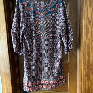 Embrace a bohemian vibe with this beautifully patterned dress. Featuring a mix of blue and orange hues, this dress is perfect for any casual outing.