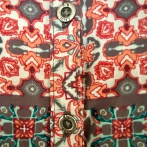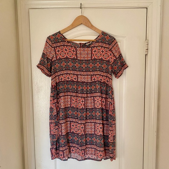 Short-sleeve dress with a vibrant bohemian pattern. Features shades of red, orange, gray and green. Empire waist with buttons on back. 100% viscose. Machine washable. Size XS. Measures 33” in length. Great summer casual dress or beach cover up for teen or young adult.