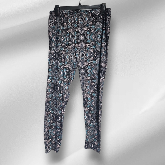 Stylish bohemian patterned pants with intricate designs. Features a mix of blue, black, and white colors.