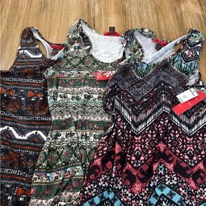 Set of bohemian style dresses with intricate patterns. Features a mix of colors including black, green, and red.