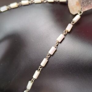 Single Clear Quartz crystal on a long chain, there are white long beads on each side of the quartz, then silver chain.