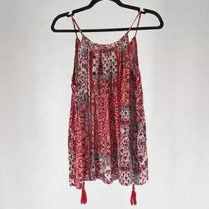 Additional Details: A sleeveless camisole top with a tie front detail and a relaxed fit, featuring a patchwork-like design in various patterns. FAB: 100% Rayon, Crochet: 100% Cotton. RN91017