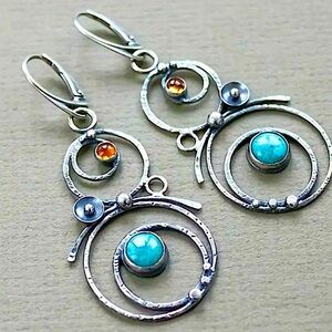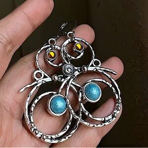 Stainless steel Handmade geometric, swirl blue stone, citrine color dangle earrings.