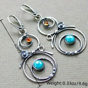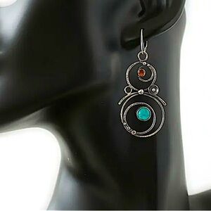 Bohemian Round Blue Stone Earrings Handmade Silver Engraved Round Dangle