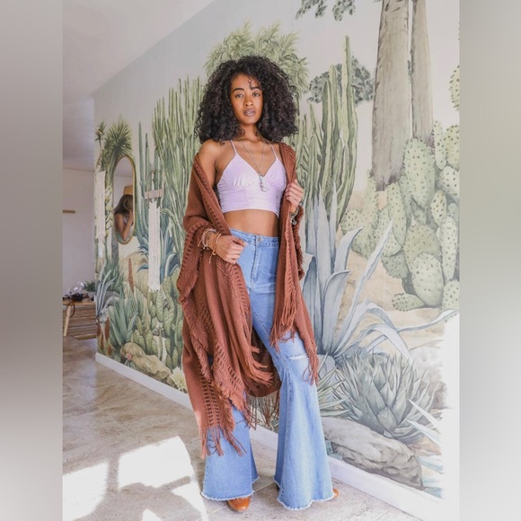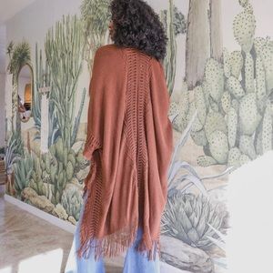This bohemian ruana is such a great addition to your fashionable wardrobe. The size is 39” x 47” and the arm hold is 26 inches around. Great for those just right seasons.