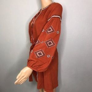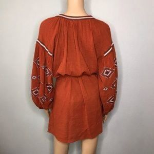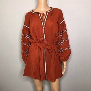 Embrace a bohemian vibe with this rust dress featuring intricate embroidered sleeves. Perfect for any occasion, this dress combines style and comfort effortlessly with a removable waist tie. A snap button closure at the front is great for breastfeeding moms.