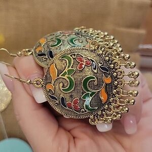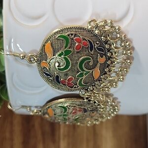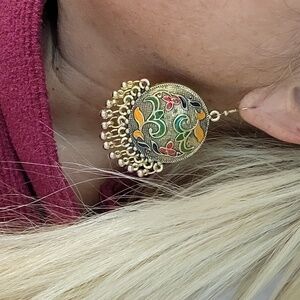 Vibrant handpainted scrolled medallions on hypoallergenic wires with small jhumka detailing for lots of movement along the bottom. Vintage finish.
