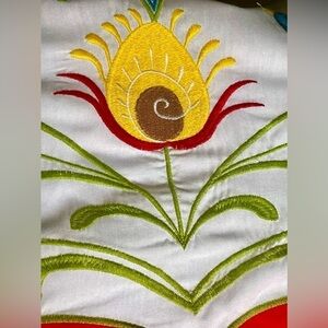 A lush garden scene is embroidered all over this fabulous bohemian grown surely ready to tell and amazing love story. This fabulous dress is figure-flattering with a plunging breezy, flared skirt. The embroidery on this gown is truly a work of art, classy and elegant full of vibrant colors.