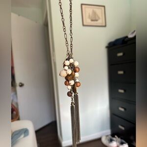 Unique necklace featuring shells and beads with tassel accents. Perfect for a bohemian look.