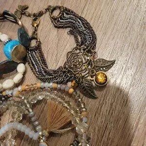 A collection of 12 assorted boho-style stackable bracelets that feature mixed materials such as: natural stone, glass beads, and alloy and metal charms.