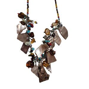 This necklace showcases a vibrant mix of natural materials and intricate craftsmanship. It combines shells, stones, and glass charms for a bold, stylish accessory.