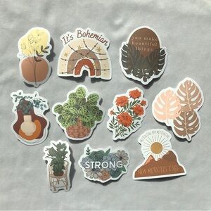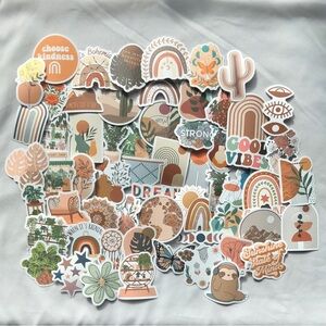 This collection features a vibrant array of 60 stickers in earthy tones, showcasing a boho-inspired design with nature-themed elements. Perfect for adding a playful touch to any decor.