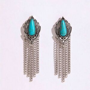 Bohemian Style Alloy Black Enamel & Green Turquoise Inlay Chain Tassel Earrings