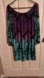 Flowy Lovely J bohemian dress featuring vibrant blue and purple patterns and belled sleeves. Beautiful and comfortable all at once!