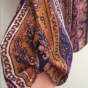 Romper. Beautiful patterned romper. Button cuff detailing on the side of the shorts. Mid arm length sleeves. V-neck. 4 secure buttons down the front. Slimming waist tie blends into fabric. Rayon material. Worn once. Washed once.