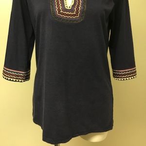 This peasant blouse stays true to boho character with distinctive qualities of poet sleeves, purple & tan embroidery, with a singular button on top..