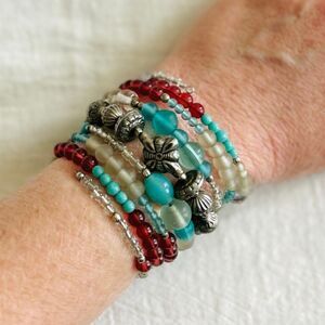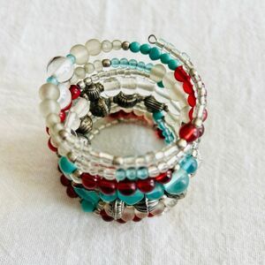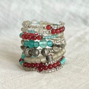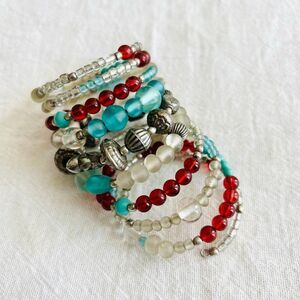 Bohemian Turquoise Blue Red and White Beaded Memory Wire Wrap Bracelet
