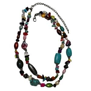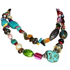 Vintage Bohemian Turquoise Rose Quartz Metal Mix Semi-Precious Stones Double Strand Bohemian Statement Necklace