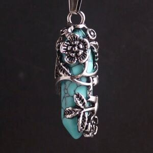 Elegant turquoise pendant necklace featuring intricate silver accents. Amazing Engraved details that offers a Feminine and Flattering style. Perfect for adding a touch of color and style to any outfit.