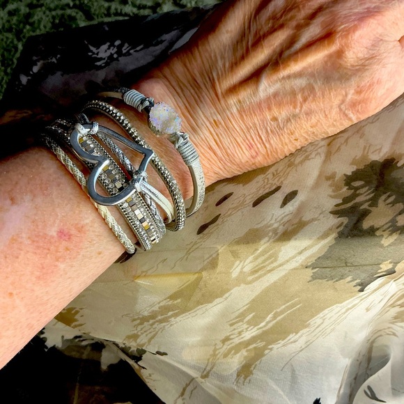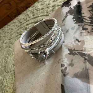 The bohemian style bracelet features multiple layered strands with a mix of textures and materials, creating a casual yet stylish look. The strands include braided, leather, delicate chains and sparkling, embellishments all in silver and gray tones. One of the standout elements is a heart shaped charm which adds a touch of romance to this piece.This bracelet also has a decorative stone within the heart charm, likely, a natural or raw stone, enhancing its bohemian appeal. It is easy and easy off with a magnetic closure.